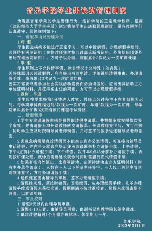 5.请假结束后,须按时销假;若需续假,应办理续假手续;凡不办理请假手续或请假未获批准者、假期期满不按时返校者、续假未准而逾期不归者,以旷课处理。