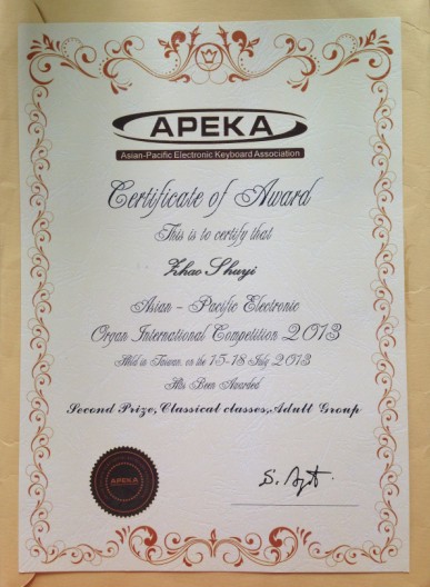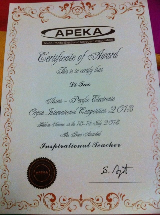2013年7月在台湾东海大学举行的亚太地区双排键电子琴国际比赛中,公司伟德国际bevictor青年教师赵书一荣获成人古典组二等奖,她的青蓝计划导师、国家一级演奏员李涛教授荣获优秀教师奖。