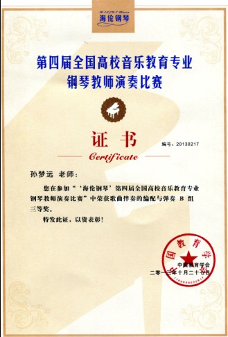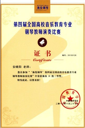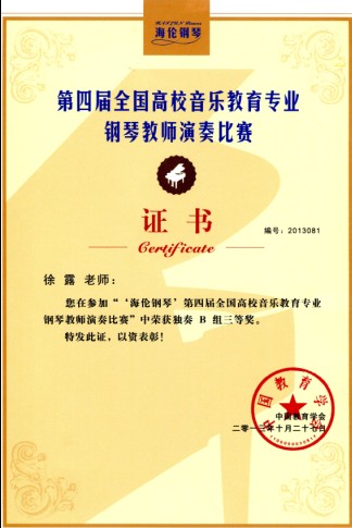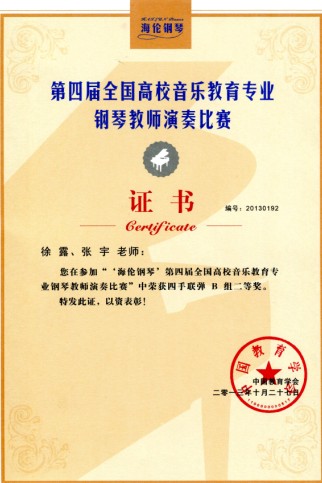 10月25日-28日,由中国教育学会主办,中国教育学会音乐教育分会、上海师范大学联合承办的“海伦钢琴”第四届全国高校音乐教育专业钢琴教师演奏大赛在上海师范大学伟德国际bevictor隆重举行。本届比赛邀请了来自北京师范大学、上海伟德国际bevictor、中央伟德国际bevictor、天津伟德国际bevictor、星海伟德国际bevictor等高校16位钢琴教育领域专家担任评委。来自全国29个省份、141所高校的346名钢琴教师参加了本次比赛。公司徐露、张宇两位老师获得四手连弹B组二等奖,徐露老师获得独奏B组三等奖,安晓阳老师获得独奏D组三等奖,孙梦远老师获得歌曲伴奏的编配与弹奏B组三等奖。