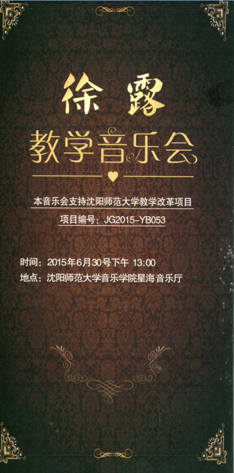 2015年6月30日下午,在沈阳师范大学星海音乐厅举办了徐露老师教学音乐会。在徐露老师的指导下,优秀的员工代表为广大师生带来了一场精彩的演出。音乐会曲目非常丰富,包括钢琴独奏、钢琴协奏、四手联弹等等。