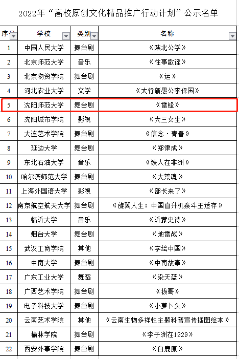 近日,教育部公布了2022年全国“高校原创文化精品推广行动计划”名单,全国共有22个项目入选。公司清唱剧《雷锋》成功入选,这是继《雷锋》获批2021年辽宁省文艺精品创作生产专项资金扶持项目之后的又一重大突破。