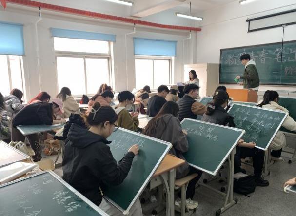 在决赛现场,同学们手持粉笔、神情专注、细致谨慎、认真书写,在“黑”与“白”的交替中,或随性,或有力,或清秀隽美,或稳重端庄。一笔一划,一勾一折,无处不体现着书写者的用心和才情。在本次决赛中,有多名同学为活动的顺利进行做出了积极的贡献。2022级音乐表演一班的梁硕同学担任主持人,宣读比赛规则;2022级音乐表演三班的杜明徽同学友情助演弹奏钢琴,欢快优美的音乐舒缓了参赛选手紧张的心情;2022级音乐表演一班的张伟哲同学和2022级音乐学(师范)班的王姬同学认真讲解了此次活动的意义,活跃了比赛气氛。经决赛,共有十名同学获奖。