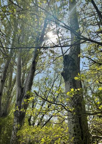 作品描述:春风吹走了寒冬,树木抽出新叶,阳光透过稠密的树叶洒落下来,它无声地向我们传递春天的气息。