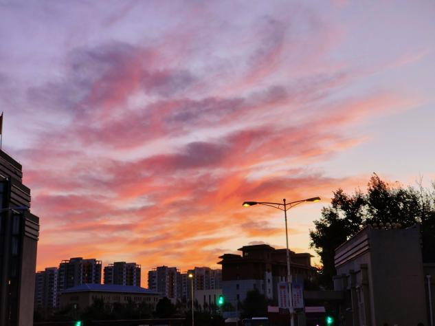 作品描述:日落时分,天空中出现了一朵朵火焰般燃烧着的晚霞,一片片一簇簇,在太阳的映射下发出金灿灿的光芒。渐渐地,晚霞变成了一团小小的火焰,然后越来越大,上半部分的颜色逐渐边淡,下半部分越来越红。